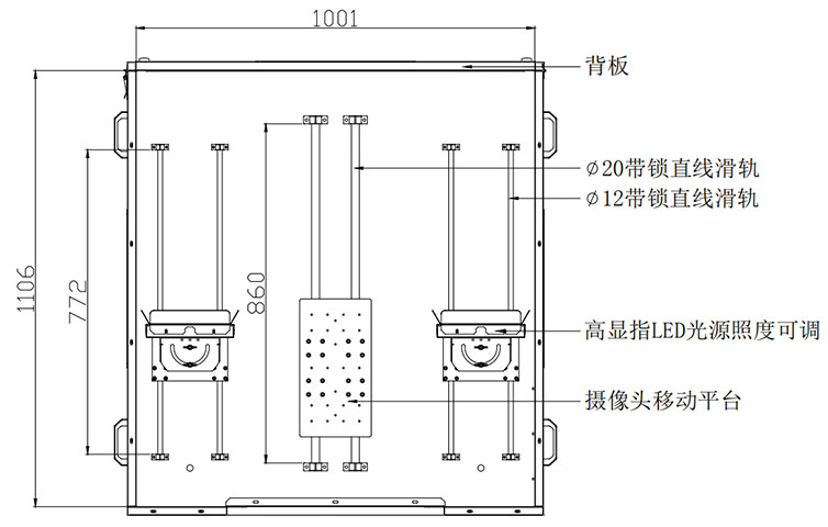 3.箱體內(nèi)部(如上圖)中間安裝有攝像頭移動(dòng)平臺(tái)(如下圖), 平臺(tái)下安裝兩根帶鎖直線滑軌,平臺(tái)可前后移動(dòng),也可移動(dòng)到某- -位置鎖緊滑軌固定。