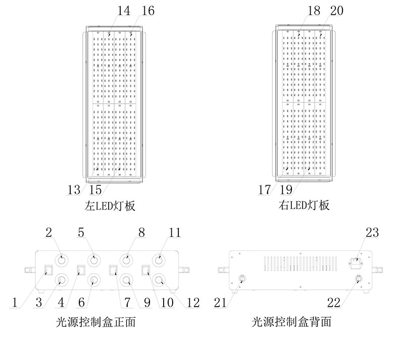 19-右3路LED光源 20- -右4路LED光源 21-LED電源連接線插頭1 22-LED電源連接線插頭 23-光源控制盒插座