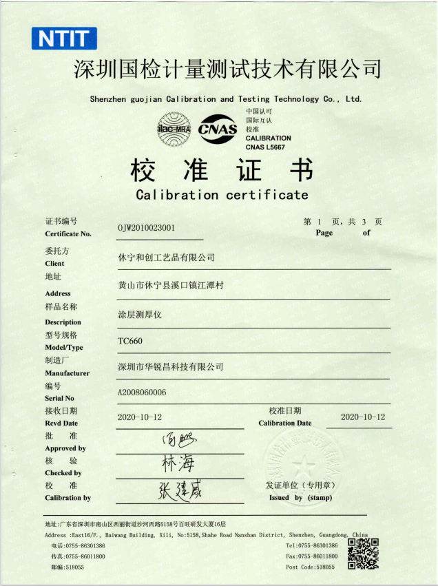 校準(zhǔn)證書-HRC華銳昌涂層測厚儀TC660