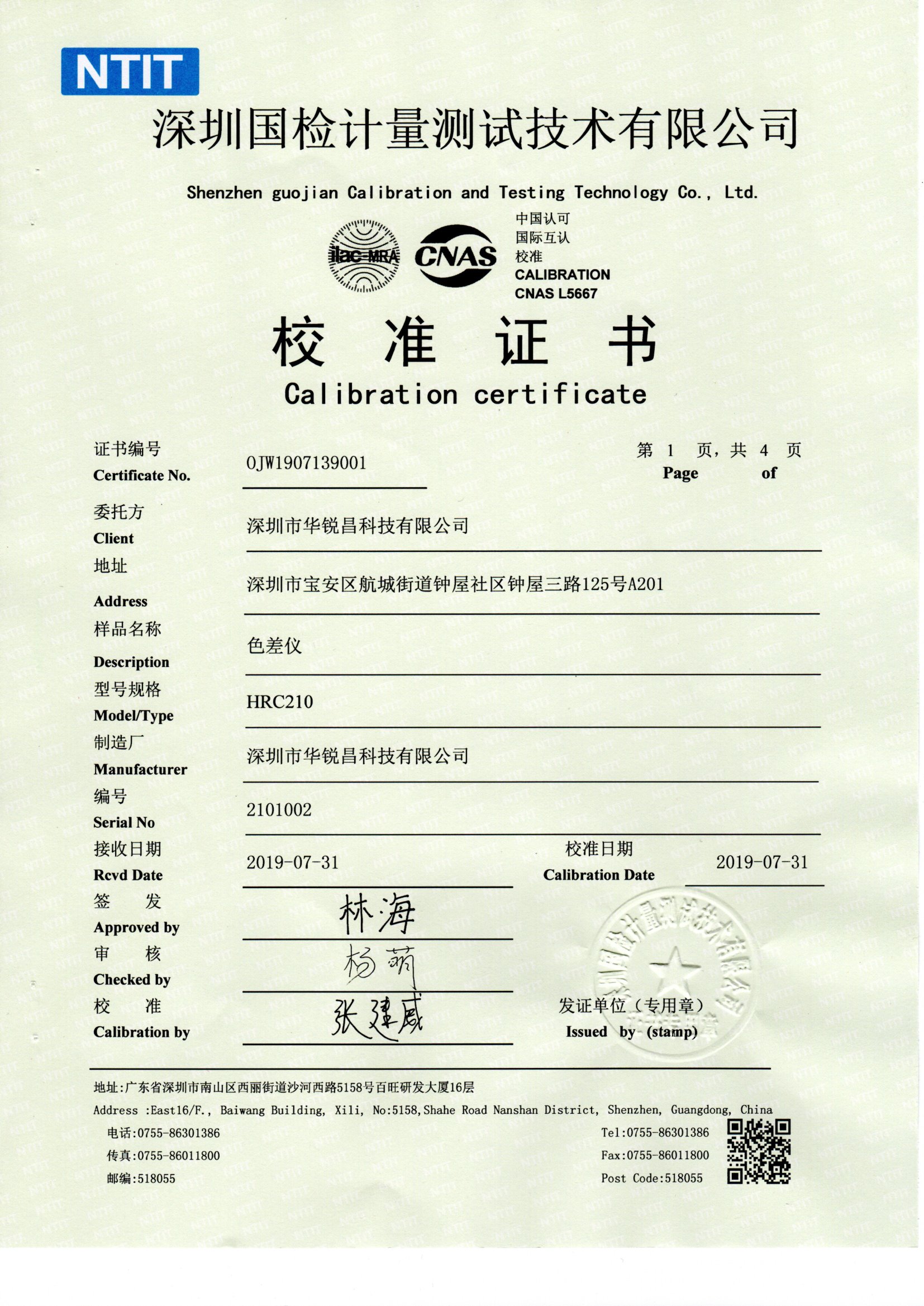 HRC華銳昌色差儀國檢檢測(cè)報(bào)告校準(zhǔn)證書