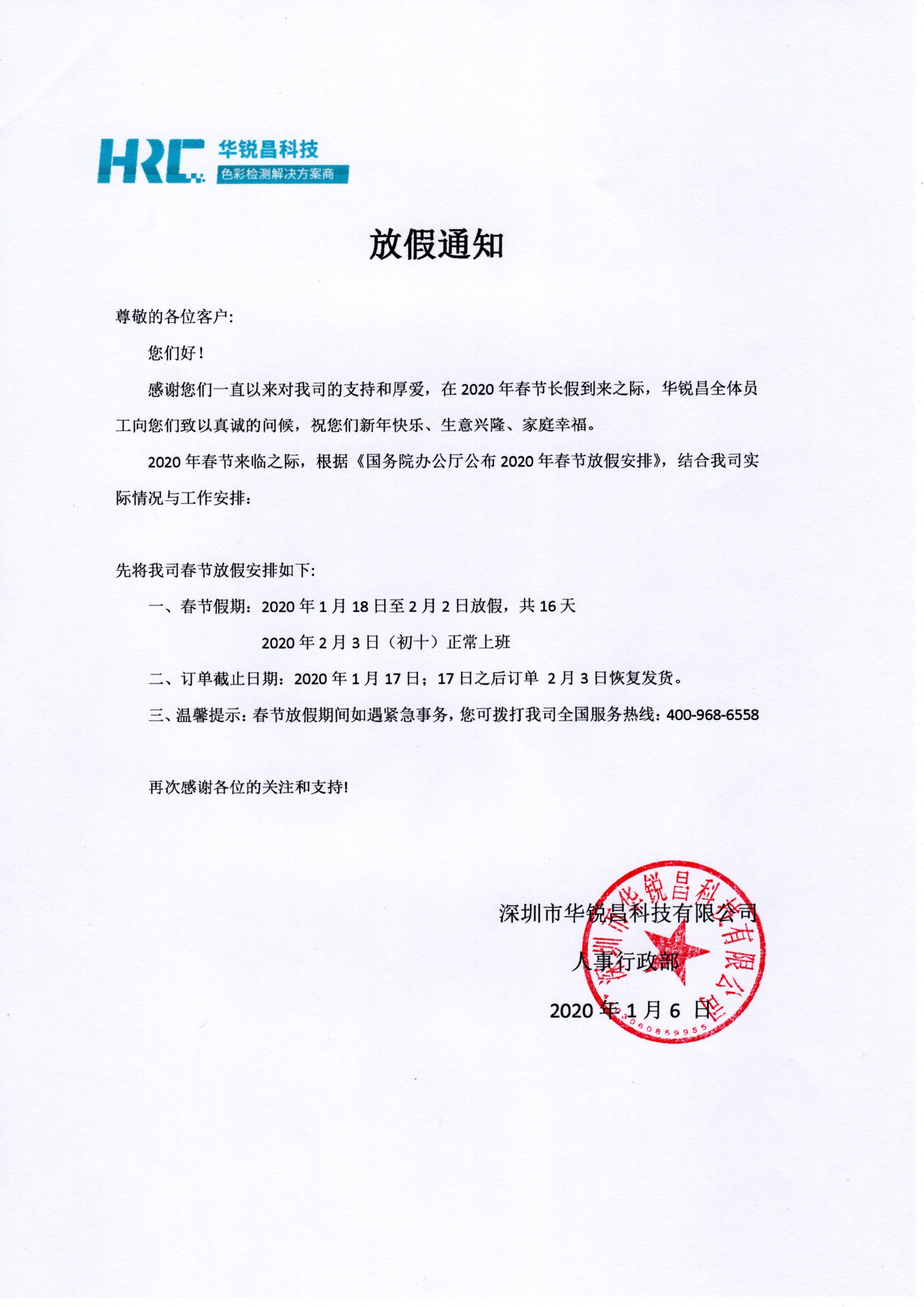 三、溫馨提示:春節(jié)放假期間如遇緊急事務,您可撥打我司全國服務熱線:400-968-6558